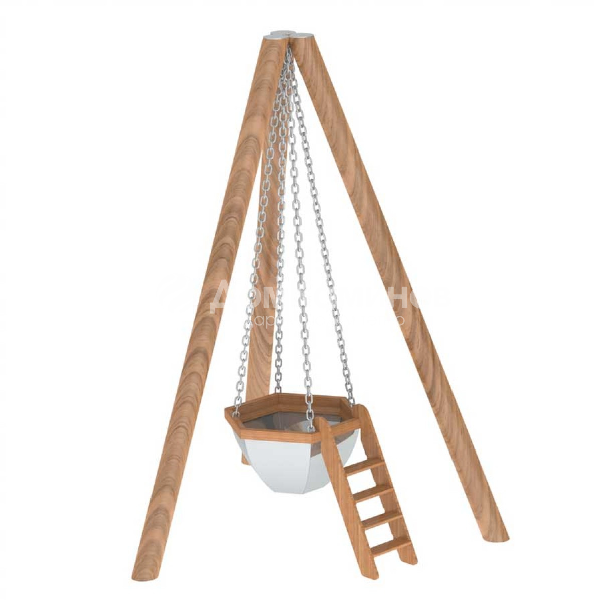 Для подвесной применен сверхнадежный яхтенный такелаж, применяемый на морских суднах и способный удерживать мачты в шторм. Это говорит о максимально надежном креплении банного чана к бревнам. Крепеж не ослабят ни сильные ветры, ни даже ураганы!
