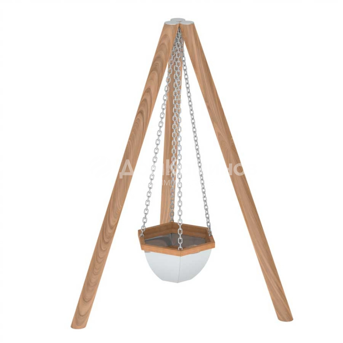 Банный чан на бревнах отличается эффектным, колоритным дизайном. Изделие предлагается в комплекте с тремя большими и толстыми бревнами из алтайского кедра, высотой до 6 метров. Чан подвешивается к треноге при помощи прочных стальных цепей. Снизу располагается костер для нагрева воды, а доступ к чану осуществляет деревянная лестница-подиум с противоскольжением. Подставки в данной модели нет.