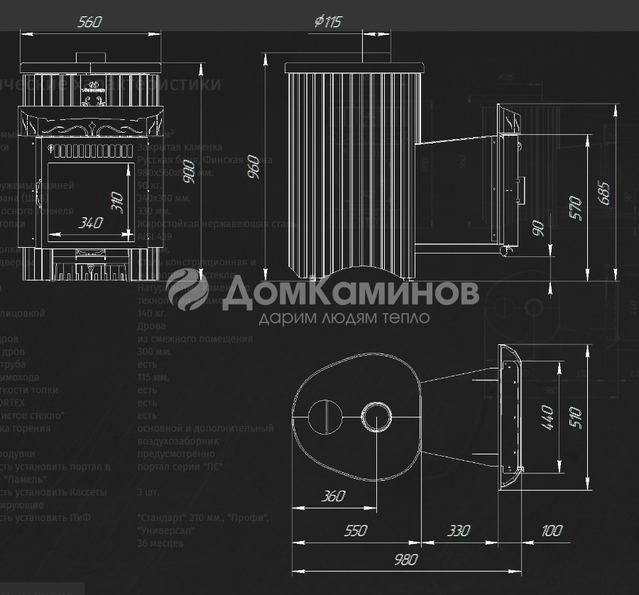 Большая масса камней, разогревается очень сильно, а дров уходит немного, благодаря полному сжиганию дымовых газов. Использование эффекта «Vortex», позволяет извлечь всю энергию и направить её на нагрев большого количества камней. Ферингер, это печь для Русской Бани, она качественно прогреет как маленькую, так и самую большую парную.