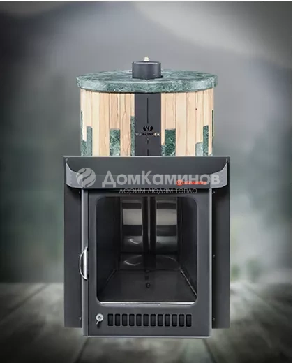 Колосниковая решетка в этой печи для бани на дровах отсутствует. Заложенные дрова разжигают сверху. Не имея над собой препятствий, огонь сразу передает тепло каменке. Пламя постепенно спускается, каждый слой дров прогорает полностью. Система Vortex создает вихревые газовые потоки, не дает пламени подниматься в дымоход. Такие инженерные решения обеспечивают печи высокий КПД, топливо расходуется экономно и эффективно.