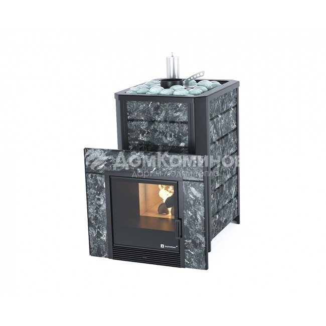 С терморегулирующей задвижкой, позволяющей максимально рационально использовать тепловую энергию и разогревать камни до температур 550-650 °C.
