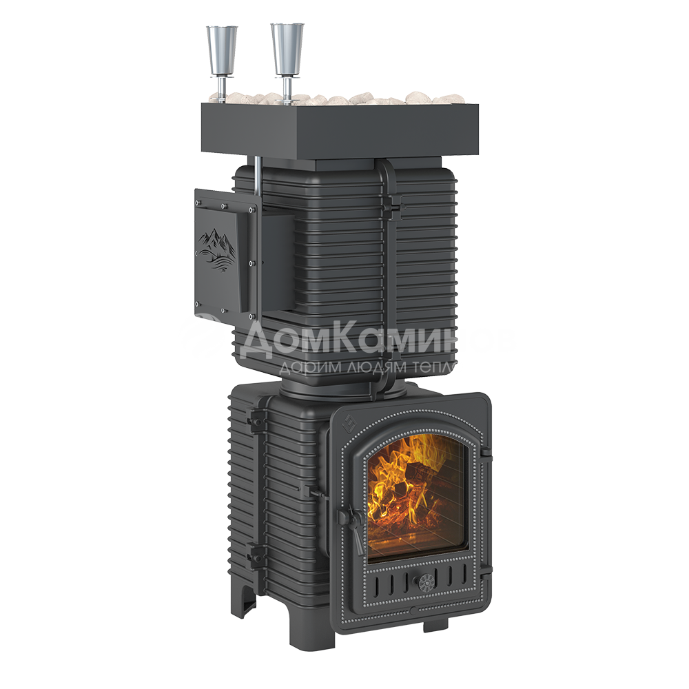 В качестве открытой каменки выше основной части печи размещён стальной поддон для камней, куда умещается более 60 кг камня. Совокупный вес печи и заклада составляет более 400 кг.