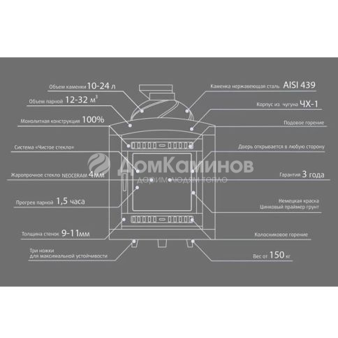 - В печи используется подовое и колосниковое горение, что позволяет нагреть парильное помещение за полтора часа.