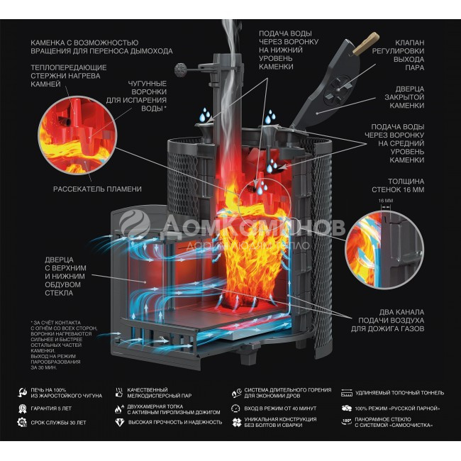 Масса пароиспарителя в печи Аванград 24 – 42 кг, и он нагревается прямым контактом с пламенем. У пароиспарителя 2 поверхности с увеличенной рабочей площадью – снизу идёт нагрев огнём, а сверху поддаётся вода для пара. Для увеличения площади испарения и нагрева первых слоёв камней на каменке отлиты высокие шипы.