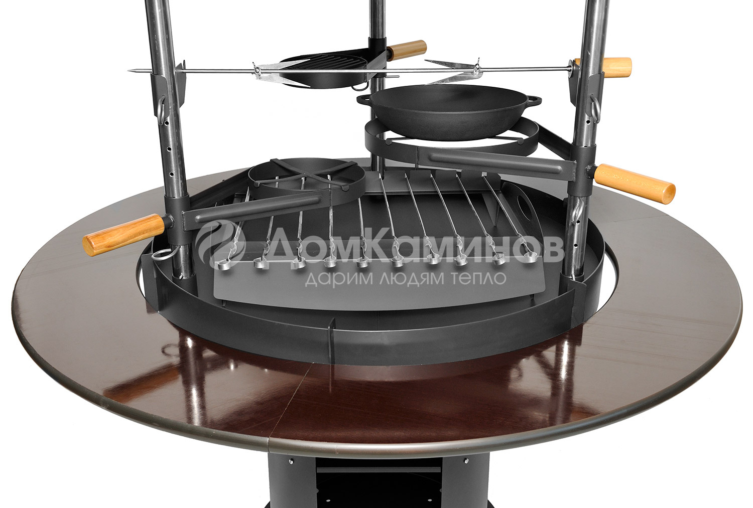 Гриль Fireline BBQ является одним из самых популярных дровяных грилей в России. Внешний вид гриля не оставляет никого равнодушным. Круглая форма отлично вписывается практически в любую обстановку, обеспечивая подход к зоне приготовления с любой стороны. Цвета гриля выбраны так, чтобы он не привлекал к себе слишком много внимания, оставляя эту прерогативу Вам. При этом на корпусе не будет видно следов жира, копоти и прочих попутчиков грилинга. Дровяной гриль Fireline BBQ очень надежен и долговечен. Чаша гриля и его купол выполнены из 3 миллиметровой стали, с дополнительными кольцами прочности. В совокупности эти два фактора ни при каких обстоятельствах не позволят грилю потерять форму. В нижней части гриля располагается отсек для хранения принадлежностей, а также зольник. Верхняя часть укомплектована металлическим зонтиком против дождя и прочих осадков. Гриль Lappigrill BBQ оснащен двумя независимыми, оснащенными лифтовым механизмом, платформами. Они с легкостью регулируются по высоте, что позволяет контролировать процесс жарки и готовки. На одной из них находится контактный гриль для жарки стейков. На втором чугунная сковорода, вместо которой можно установить казан. В базовой комплектации барбекю гриль Fireline BBQ оснащен: шашлычным модулем с 8 прочными шампурами из нержавеющей стали с деревянными ручками; набором для томления рыбы, состоящим из двух дощечек, выполненных из липы и ольхи, с зажимами из нержавеющей стали; чугунной сковородой, контактным грилем со съемной ручкой для жарки стейков; вертелом из нержавеющей стали; барбекю решеткой из нержавеющей стали, диаметром 72 см.; кочергой; колосником. Так же в качестве дополнительного аксессуара гриль может быть оснащен всепогодным чехлом и дополнительными трубами, с проходным элементом через крышу.