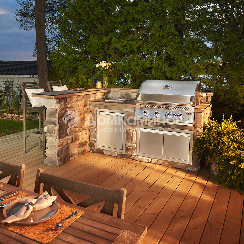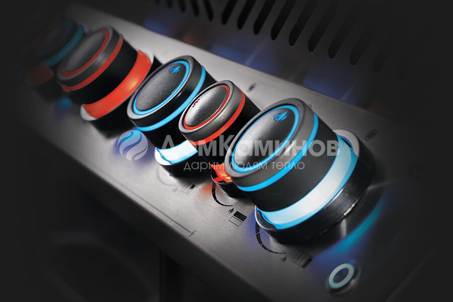 Ручки управления горелками с подсветкой с функцией Safety Glow™: ручка включенной горелки светится красным цветом, а выключенной горелки – синим (для комфортного работы с грилем в темное время суток). Возможно настраивать цвет подсветки ручек. Работает от сети 220 В.