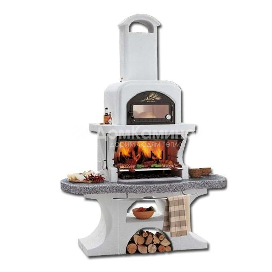 Барбекю из бетона. Печь с жаропрочной топкой. Двойная задняя стенка. Широкая столешница из Marmotech с отделкой под серый гранит. Чугунная дверца с керамическим стеклом. Гриль-решетка 76х40 см с бак.ручками. Зольник с системой циркуляции воздуха "fast-fire-box". Имеет духовку из нержавеющей стали.