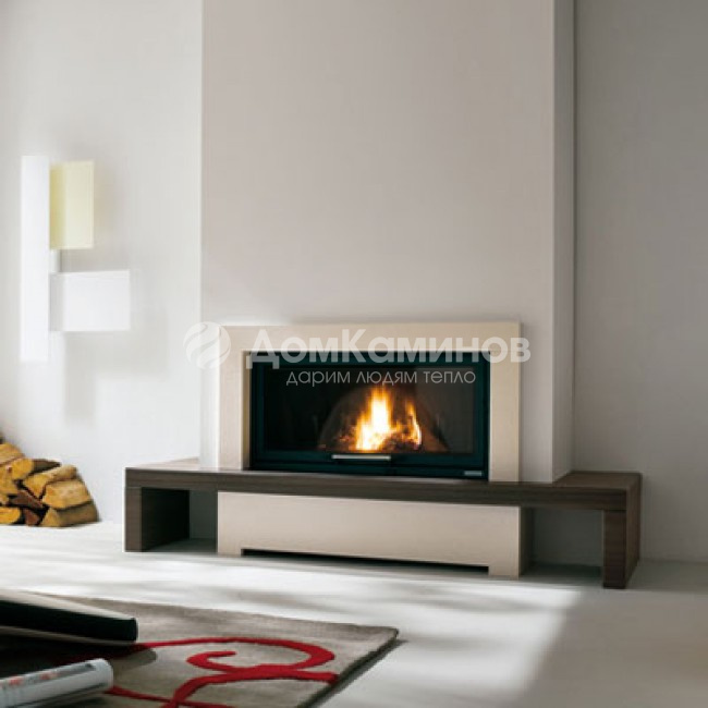 Камин изготовлен из белого мрамора Limestone с обработкой brushed и кварцита Wenge с эффектом старения.