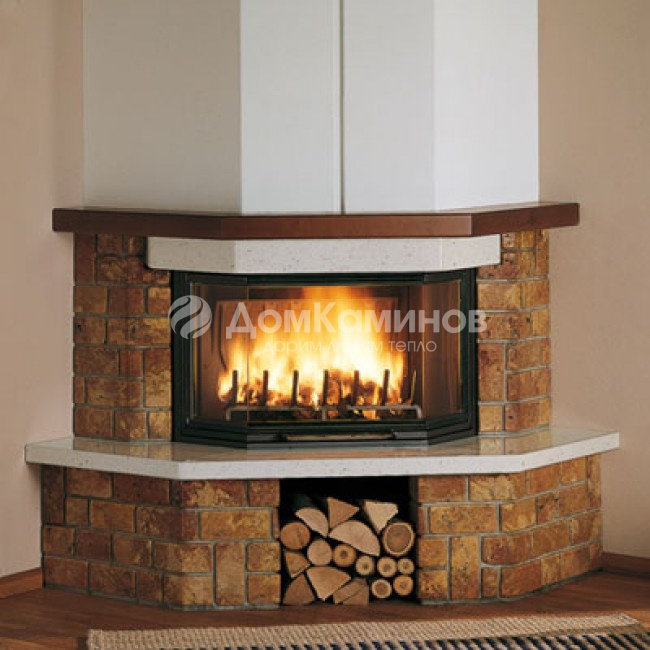 Угловой диагональный камин из мрамора Soleado. Столешница из полированного мрамора Bianco Mediterraneo. Каминная полка из массива сосны под орех.