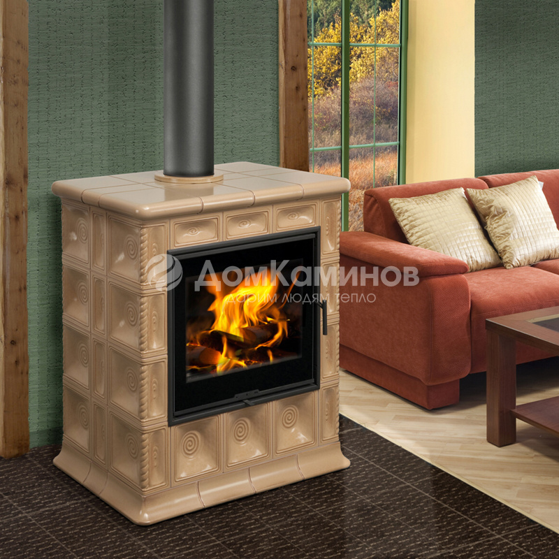 Имеет ряд достоинств:- широкий обзор пламени;- быстрый прогрев помещения;- длительное горение от 4 до 6 часов (режим медленного горения)- топка полностью проложена шамотным кирпичом и чугунный колосник;- экономичный расход топлива при высоком КПД (до 82%);- возможность подсоединения отвода продуктов сгорания сверху или сзади;- возможность выбора оригинального рисунка на изразце;- специальные аккумуляционные блоки из керамики (остывание до 2 часов);- централизованная подача воздуха (ЦПВ);- подача первичного и вторичного воздуха, благодаря которому стекло дверцы обдувается и не происходит его загрязнения( система очистки стекла);- возможность выбора керамического изразца в 30 глазурованных цветах.