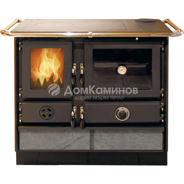 Дровяная кухонная плита предназначена для отопления небольших дачных домов и приготовления пищи. Печь изготовлена из чугуна и эмалированной стали. Эмалированное покрытие обеспечивает продолжительный срок службы печи и отвечает за эстетичный внешний вид. Доступно четыре цвета эмалированного покрытия: красный, кремовый, бордовый и черный. Печь укомплектована большой чугунной варочной поверхностью с одной конфоркой и стальным эмалированным духовым шкафом для приготовления пищи. Духовой шкаф габаритами ВхШхГ, мм - 265х350х465 оснащён протвенем и датчиком температуры. Для подключения к системе водяного отопления используется теплообменник-змеевик объёмом 11 л и мощностью 8.5 кВт. Топочная камера состоит из чугунных плит. Дверцы топки и духовки укомплектованы термостойкой стеклокерамикой. Замок и уплотнительный шнур обеспечивают герметичное закрывание дверец. Проём для загрузки дров Ш×В - 280х230 мм. Ящик для золы спрятан за герметичной чугунной дверцей. Дверца зольника снабжена устройством точной регулировкой подачи воздуха в топочную камеру. Колосниковая решетка подвижная для встряхивания золы. Для подключения к дымоходу предусмотрен патрубок, который монтируется на верхней и задней части плиты, справа или слева.