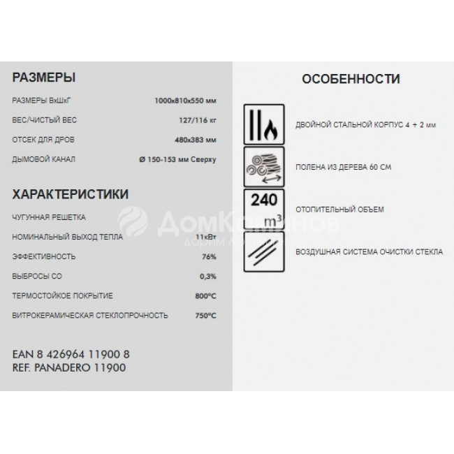 Корпус печи изготовлен из стали. Мощность печи составляет 11 кВт, что достаточно для отопления помещения до 240 м3. Стеклокерамическая дверка выдерживает температуру до 750оС. Диаметр дымоходной трубы 150 мм.