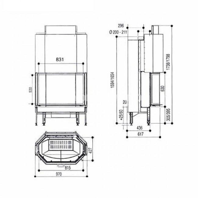 Каминная топка с призматическим стеклом, вертикальным подъемом дверцы, дверца с черной отделкой. Выполнена топка из высококачественной стали, внутри футерована шамотным кирпичем.
