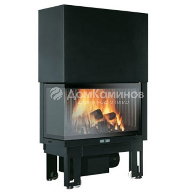 Закрытая топка с металлическим корпусом темно-серого цвета. Дверца с боковым стеклом, окрашенная в черный цвет, единое витрокерамическое фронтально-боковое стекло с подъемным механизмом.