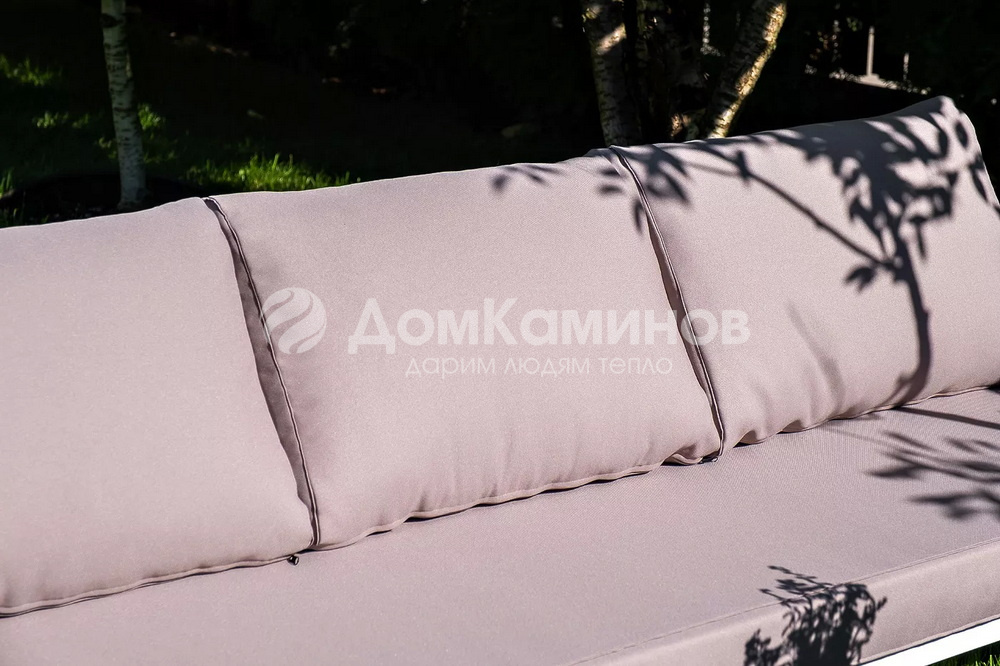 Трехместный диван "Канны" с подушками в комплекте. Диван имеет алюминиевый каркас, окрашенный порошковой краской в темно-серый цвет. Боковины каркаса вручную оплетены роупом - эластичными синтетическими лентами, изготовленными из высокопрочных полиэфирных волокон. Цвет оплетки в тон каркасу - темно-серый. Подушки состоят из наполнителя и съемных чехлов, которые обработаны влагоотталивающей пропиткой. Материал - 100% полиэстер, плотностью 230гр/м2.