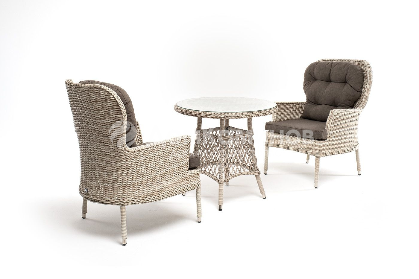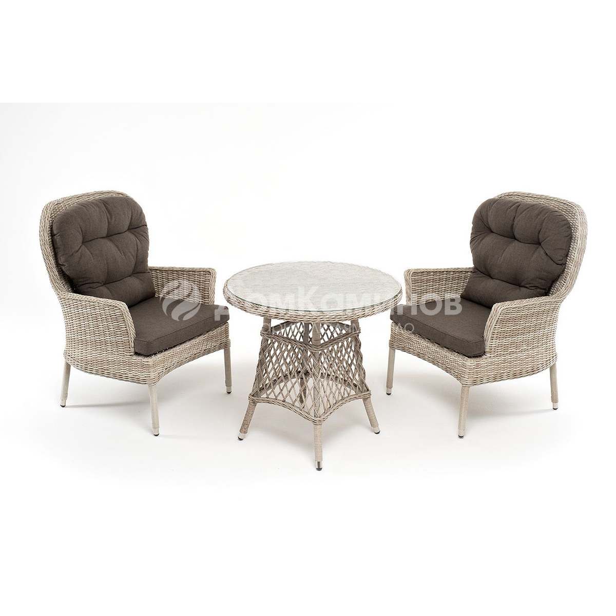 Кофейный комплект «Алиса» рассчитан на 2 персоны и подходит для расположения на балконе, в небольших гостиных, на террасе и других местах с ограниченным пространством. В основе каркас из алюминия.В состав входят:– круглый стол 800×800×750 мм (толщина стеклянной столешницы в 0,5 см).– 2 кресла - 710×820×1105 мм.Плетение выполнено вручную круглым искусственным ротангом бежевого цвета, кресло укомплектовано подушками из 100% полиэстера, которые пропитаны специальным составом, обладающим влагоотталкивающим свойством.