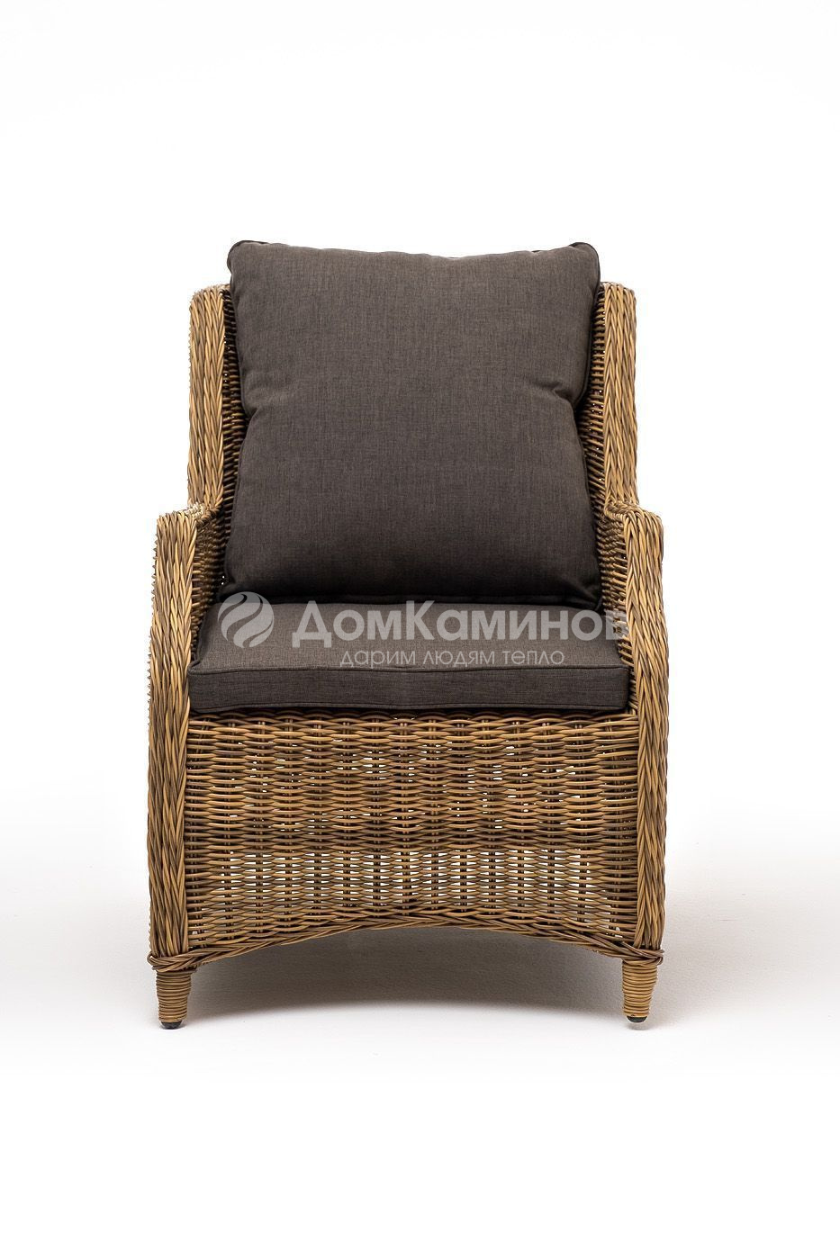 Плетенный стул дополняют мягкие подушки. Они выполнены в серо-коричневом оттенке. Пошиты изделия из плотного полиэстера 230гр/м2. Ткань предварительно обрабатывается влагоотталкивающей пропиткой.