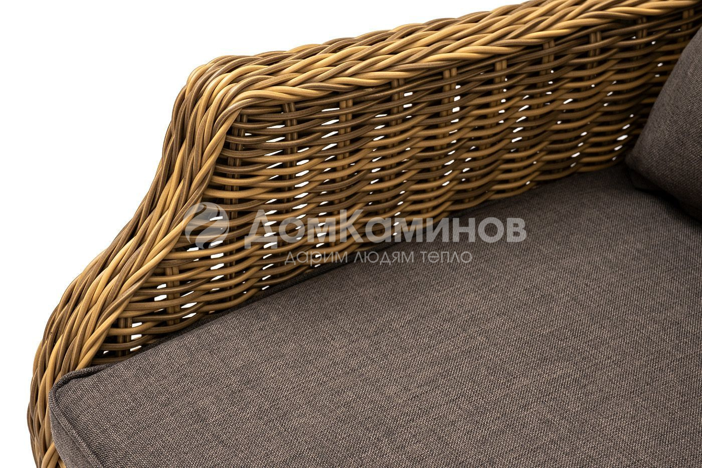 Спинка и подлокотники имеют планые линии, благодаря своим закругленным формам. Каркас мебели сделан из алюминия. Присутствует ручное круглое плетение, при изготовлении которого используется искусственный ротанг. Представлено в соломенном цвете.