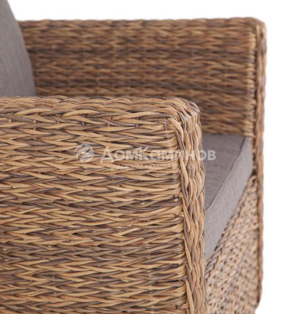 Каркас изготовлен из прочного алюминия, оплетенного вручную искусственным ротангом вида "гиацинт" соломенного оттенка.