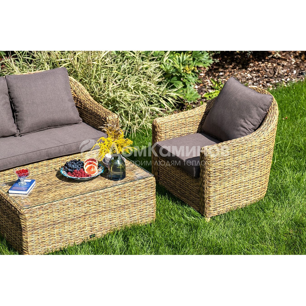 Кресло из искусственного ротанга «Кон Панна» имеет компактные размеры 780×800×800мм.Модель имеет относительно небольшой вес - 17 кг, а так же обладает прочным основанием, которое состоит из алюминиевого каркаса, оплетенного вручную искусственным ротангом вида "гиацинт" соломенного цвета.
