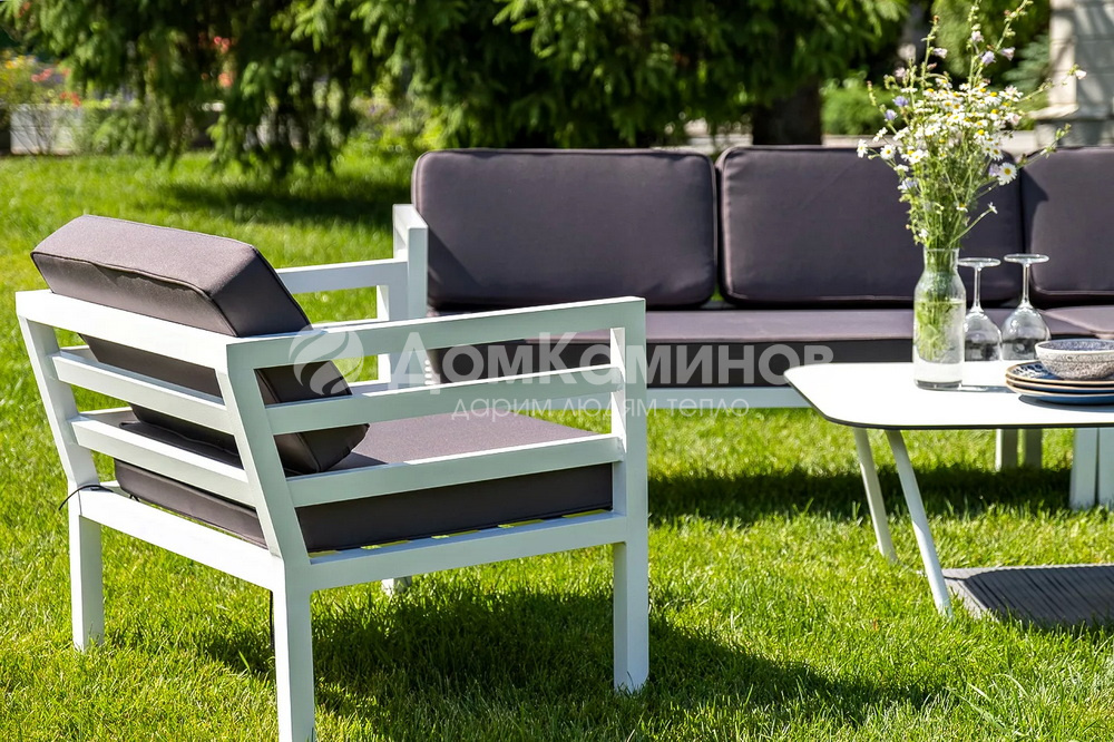 Металлическое кресло «Глория» для обустройства лаунж-зоны. Каркас изделия изготовлен из прочного, но легкого алюминия белого цвета. На сидении и спинке плоские подушки с серыми съемными чехлами, которые можно стирать в стиральной машине с использованием специальных средств.Кресло разработано специально для использования в общественных местах, в том числе и под открытым небом в любую погоду.