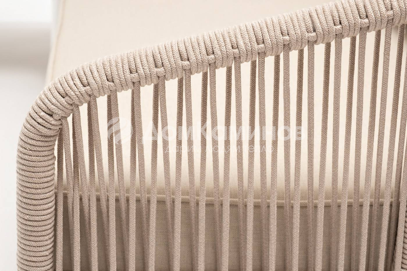 Каркас уличной мебели выполнен из износостойкого алюминия. Его дополняет бежевая ручная оплетка, изготовленная на основе эластичных синтетических лент из полиэфирных волокон высокой прочности (роупа).