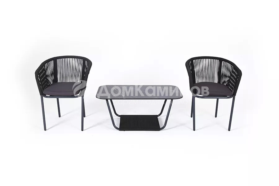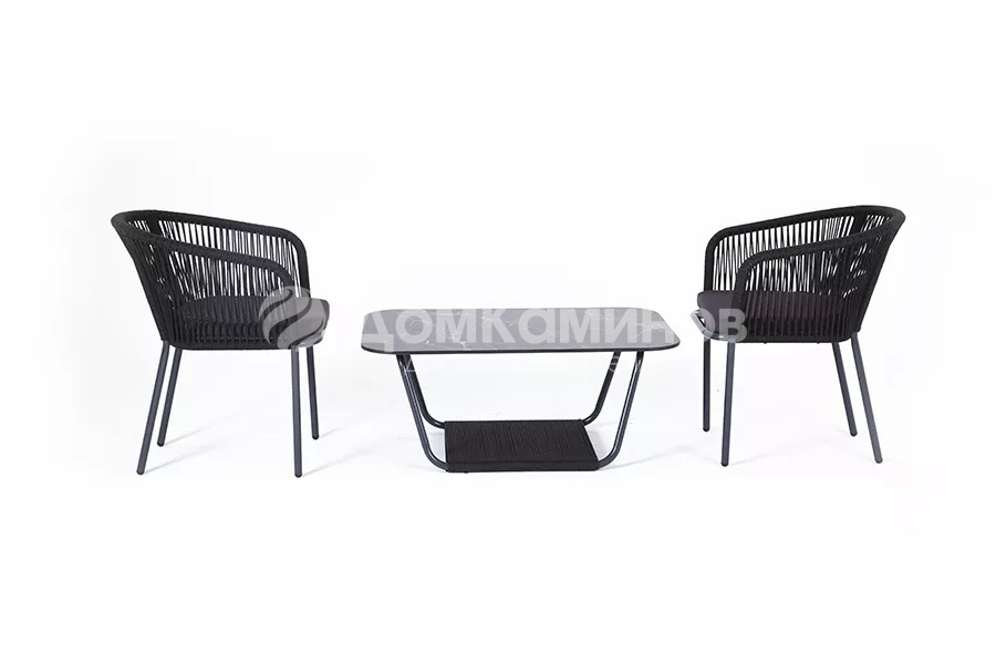 Каркас мебели изготовлен из алюминия темно-серого цвета. Материал столещницы - HPL, это высококачественный монолитный компакт-пластик, толщиной 12 мм. Цвет поверхности - "черный мрамор". Каркас стульев и нижняя часть столика оплетены вручную эластичными синтетическими лентами из высокопрочных полиэфирных волокон (роуп). В комплект к стульям входят подушки со съемными чехлами. Материал - 100% полиэстер плотностью 230гр/м2. Предусмотрена влагоотталкивающая пропитка материала.