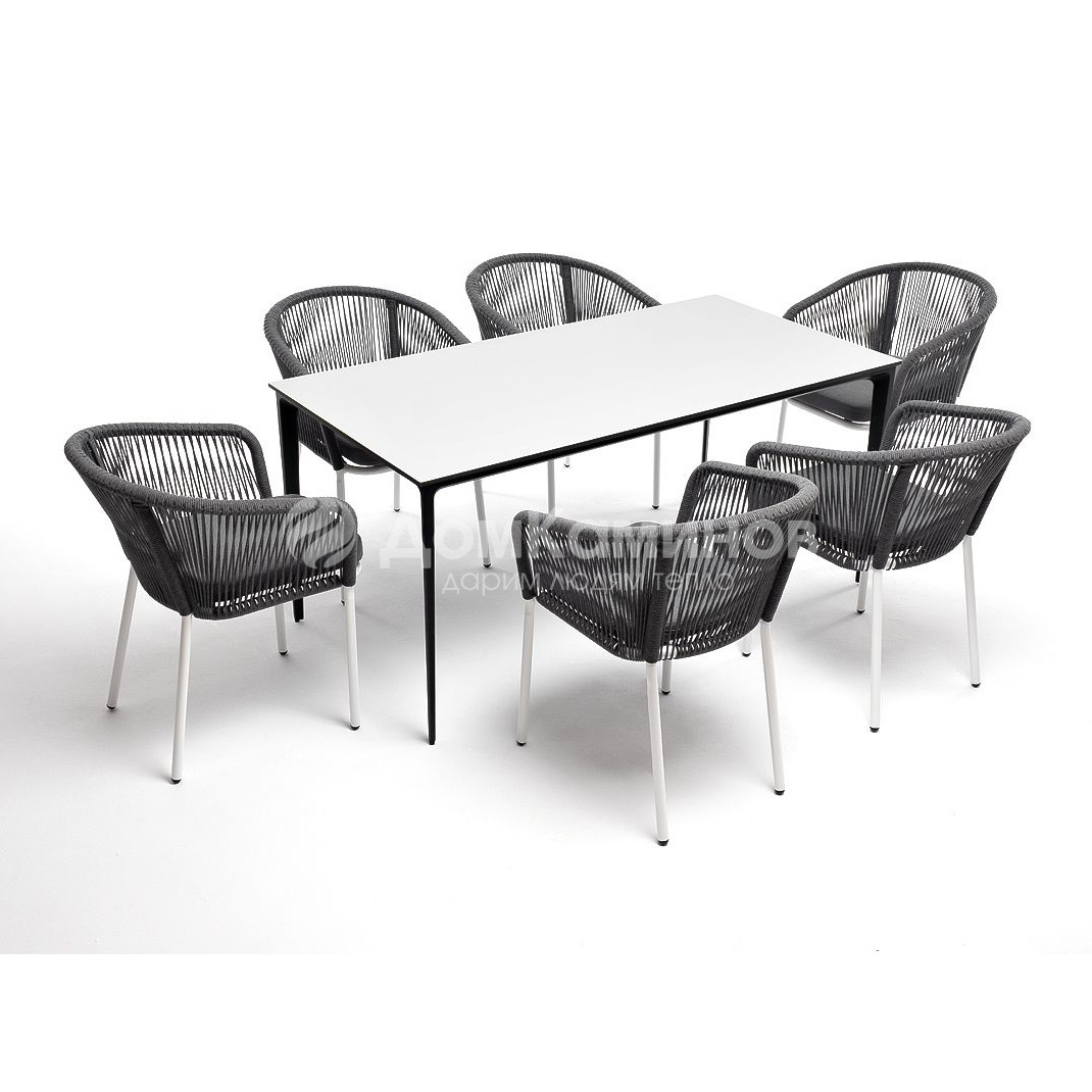 Обеденная группа «Венето» рассчитана на 6 персон.В состав комплекта входит:- Стол "Венето" со столешницей из HPL-пластика, размер столешницы - 1600х800 мм, цвет - "серый гранит". Высота стола - 750 мм- 6 плетеных стульев "Марсель" из роупа, размером - 570х620х800 мм, цвет роупа - темно-серый, каркас из алюминия, окрашен порошковой краской в темно-серый оттенок.