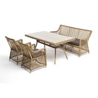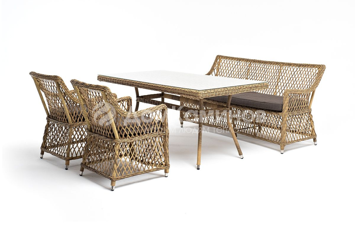 Все предметы мебели изготовлены из прочного алюминия, вручную оплетенного долговечным искусственным ротангом. На креслах и диване предусмотрены подушки со съемными чехлами и влагостойкой пропиткой. Стол укомплектован прочным стеклом толщиной 5 мм для удобства использования.