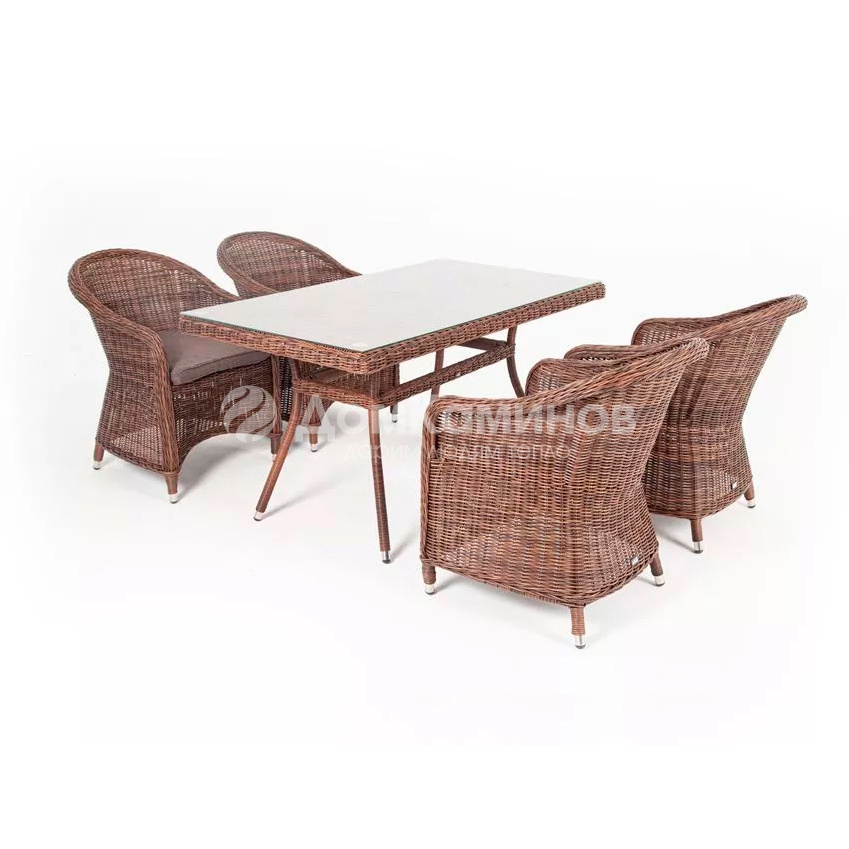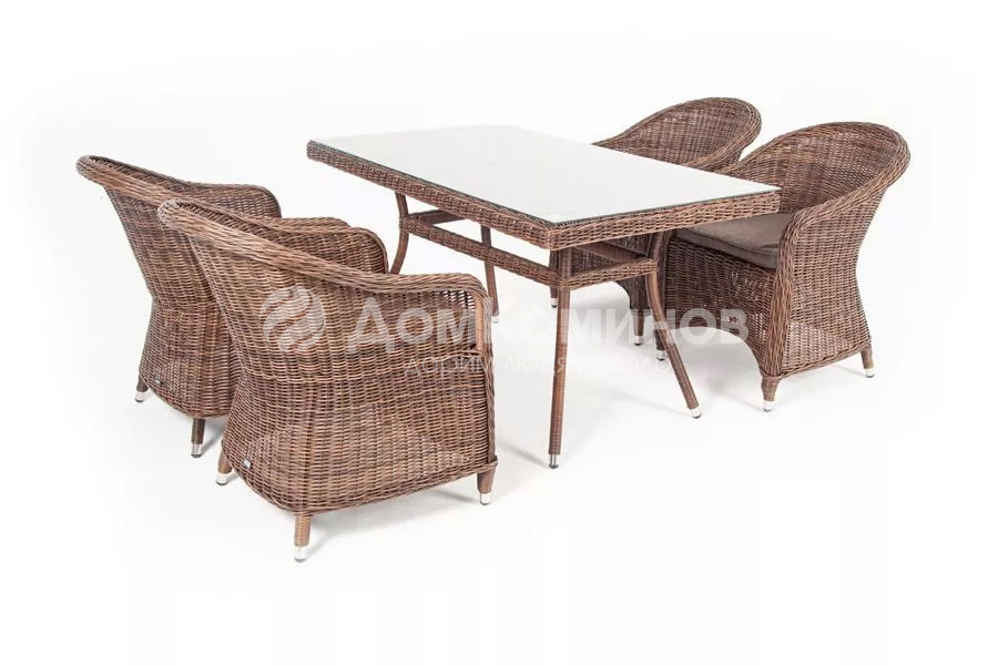 В комплект обеденной группы входит один обеденный стол, четыре стула и подушки."Равенна" - плетеное кресло в комплекте с подушками, алюминиевый каркас, круглый искусственный ротанг, ручное плетение, цвет коричневый с подушкой."Латте" - плетеный обеденный стол, цвет коричневый.
