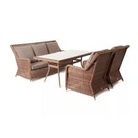 Каркас мебели алюминиевый. Он оформлен с помощью искусственного ротанга круглой формы и был оплетен ручным способом. Цвет плетения - коричневый.