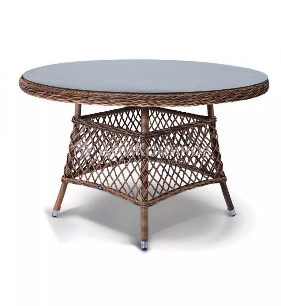 Обеденная группа из коллекции "Эспрессо" коричневого цвета состоит из:- круглого стола диаметром 1200 мм- 4 кресел "Латте" - 680х550х840 ммКомплект выполнен из круглого искусственного ротанга, в основе - алюминий.