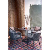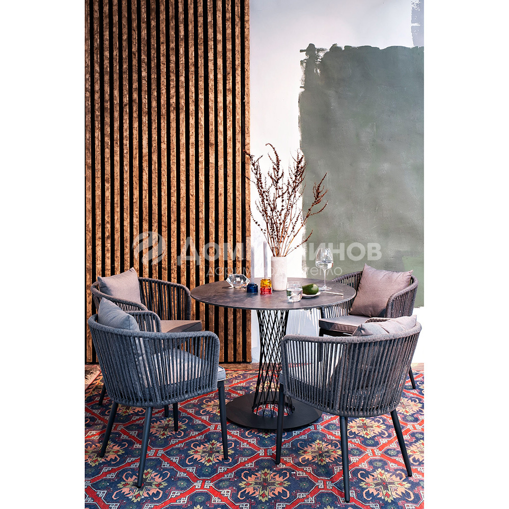 Обеденная группа состоит из одного круглого стола со столешницей HPL цвета серый гранит, диаметр 100 см (металлическое подстолье) и двух кресел из алюминиевого каркаса, оплетенного вручную эластичными синтетическими лентами из высокопрочных полиэфирных волокон, в комплекте с подушкой, цвет темно-серый.