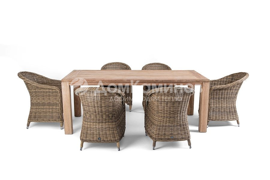 Обеденная группа на 8 персон. В комплект обеденной группы входит один обеденный стол, шесть стульев и подушки.Стол изготовлен из тикового дерева. Все стулья с подлокотниками и подушками, алюминиевый каркас, круглый искусственный ротанг соломенного цвета.