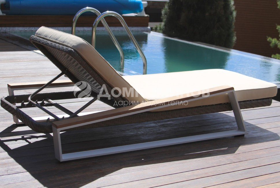 Подушки изготавливаются из текстилена. Это современный материал, сплетенный из полиэстеровой нити с виниловым покрытием. Он не подвержен гниению, и не впитывает влагу. Хорошо вентилируется, благодаря чему быстро сохнет. Материал стоек к УФ излучению солнца и не выгорает на солнце. Текстилен отлично принимает контур тела и очень прочен. Шезлонг лежак TEAKMAN имеет удобное регулируемое изголовье.