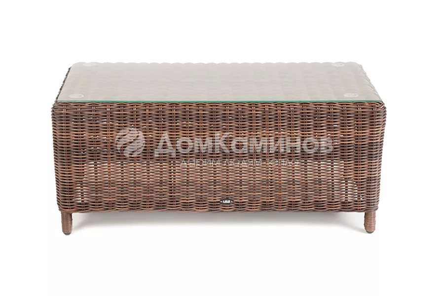 Журнальный столик из искусственного ротанга «Кон Панна» коричневого цвета, подходит для эксплуатации при различных погодных условиях. Модель оснащена прочным каркасом, изготовленным из алюминия. В качестве столешницы используется ударопрочное стекло толщиной 5мм.