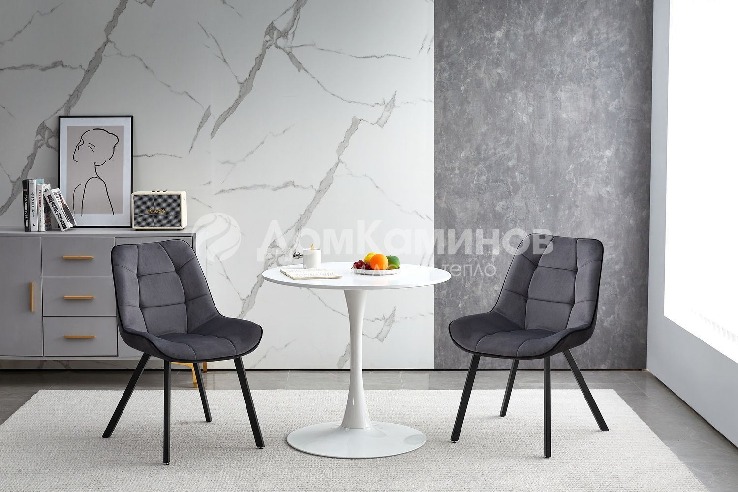 Черная столешница, сделанная из матовой керамики толщиной 12 мм, придает столу лаконичную элегантность. Металлическое основание и столб, покрытые черной порошковой краской, служат подстольем, обеспечивая устойчивость и долговечность изделия.
