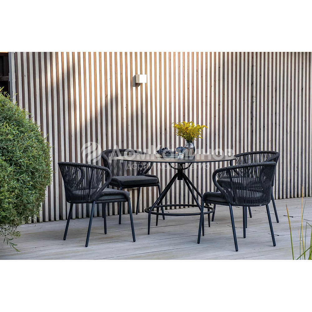 Стул "Милан" для обустройства обеденной или лаунж-зоны.Изготовлен из алюминиевого каркаса, оплетенного вручную эластичными синтетическими лентами из высокопрочных полиэфирных волокон (роуп круглый). Цвет каркаса и оплетки - темно-серыйВ комплект входит подушка со съемным чехлом из 100%-го полиэстера с влагоотталкивающей пропиткой.Размеры плетеного стула - 570х620х800 мм.