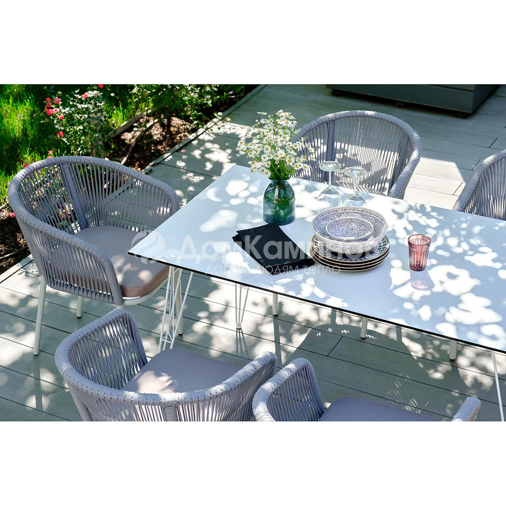 Плетеный стул из коллекции "Марсель" представен в светлых тонах. Каркас из прочного алюминия окрашен порошковой краской в белый цвет, ручная оплетка - роуп светло-серого оттенка.